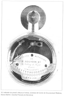 En este listado de instrumentos, comenzaremos por los termómetros, instrumentos que permiten medir la temperatura. En el Ictíneo había un termómetro que indicaba la temperatura del interior del espacio habitado y otro que indicaba la temperatura del vapor, situado en la caldera o generador.